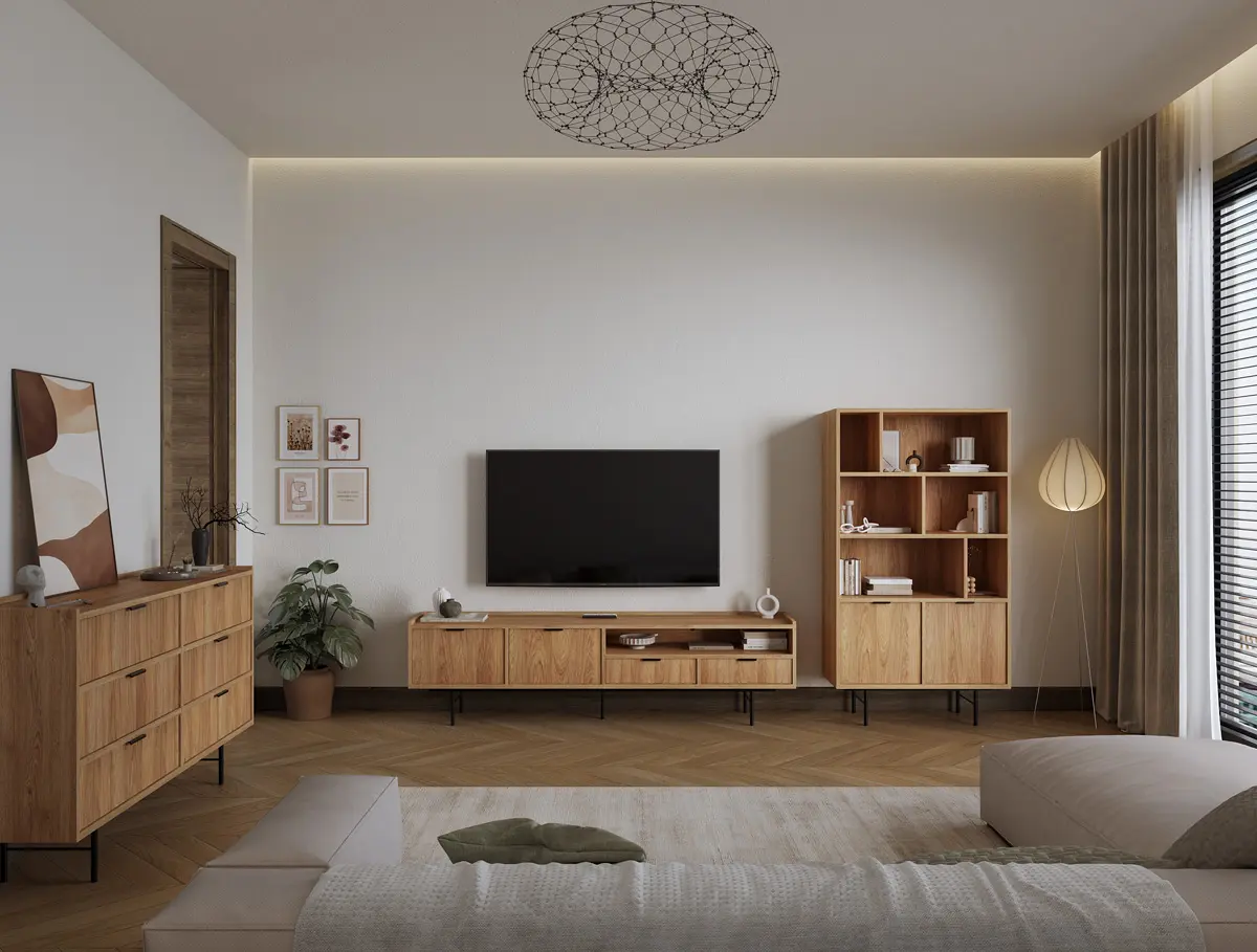 Stolik RTV z kolekcji EDISON to propozycja dla osób, które cenią meble o wyrazistym charakterze i nienagannej estetyce. Szerokość 150 cm pozwala na swobodną ekspozycję nowoczesnego sprzętu multimedialnego, tworząc spójne i uporządkowane centrum domowej rozrywki. Projekt łączy w sobie geometryczną dyscyplinę z naturalnym rysunkiem drewna, co czyni go uniwersalnym dopełnieniem współczesnych apartamentów.