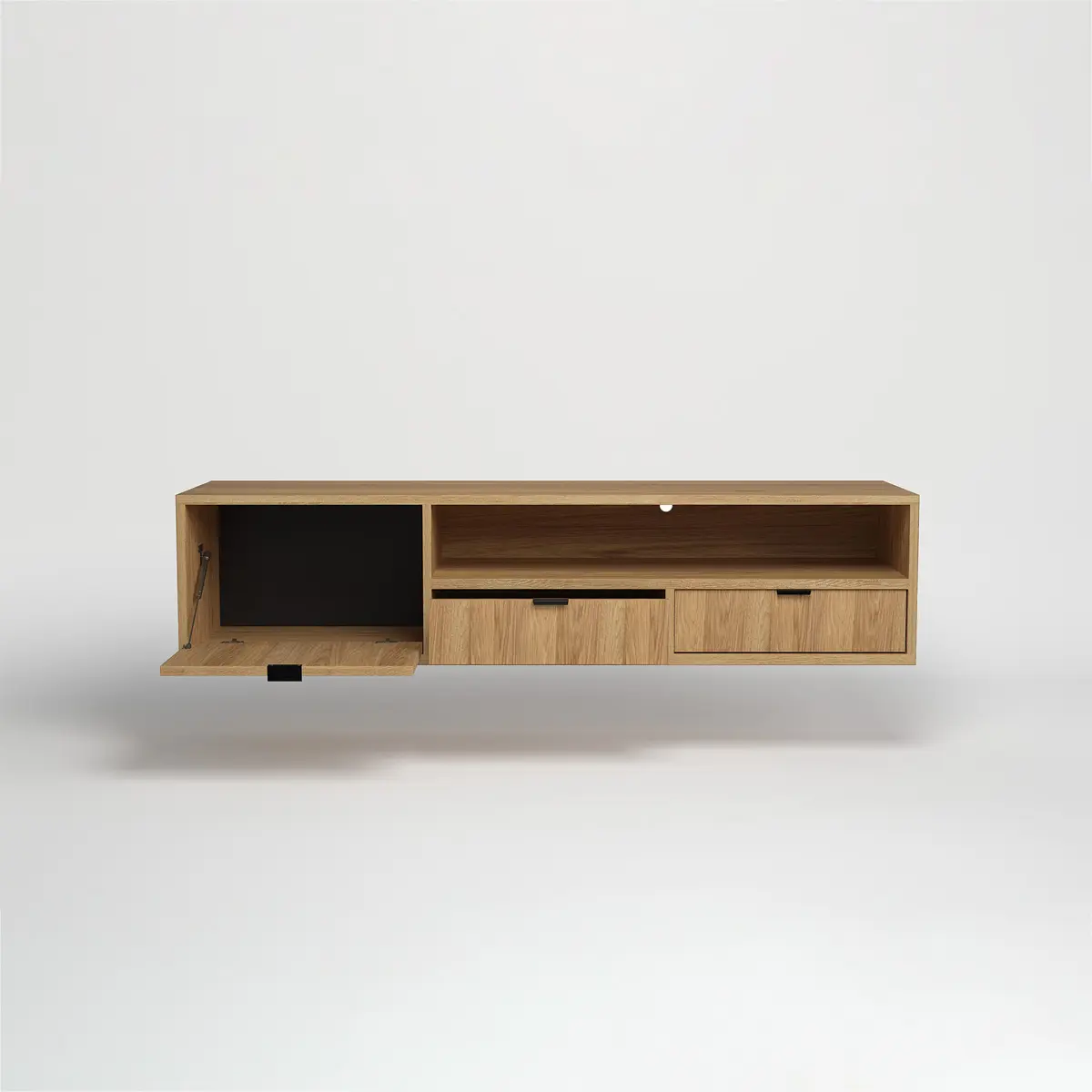 Wnęka Multimedialna: Otwarta przestrzeń pod blatem zapewnia odpowiednią cyrkulację powietrza, co jest kluczowe dla ochrony elektroniki (dekoderów, konsol czy wzmacniaczy) przed przegrzaniem.